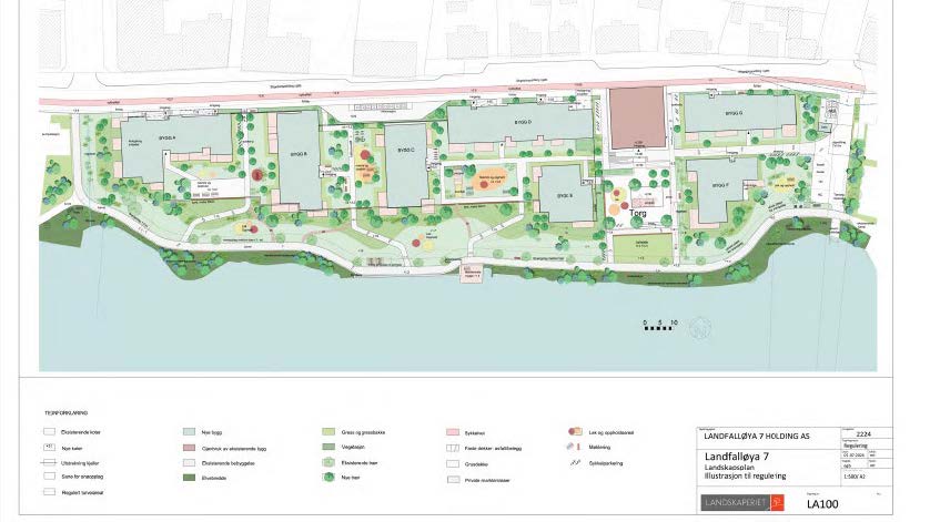 Landfalløya består i hovedsak av eneboliger, rekkehus og lavblokker, med noe nybygg under utvikling. Området har et rolig og etablert bomiljø, hvor man finner trygge nabolag og lav trafikkbelastning.